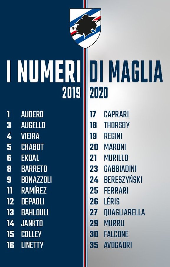 Si bien la gran mayoría de los números ya se habían visto en los amistosos "semi-oficiales" ante Mónaco y Spezia, ahora Sampdoria los comunicó definitivamente para toda la temporada que arranca este domingo ante Crotone por Coppa Italia. Como hechos salientes cabe mencionar que aún quedan vacantes importantes números en la historia blucerchiata, 7 y 10, este último dejado hace pocos días por Dennis Praet tras su partida al Leicester de Inglaterra.